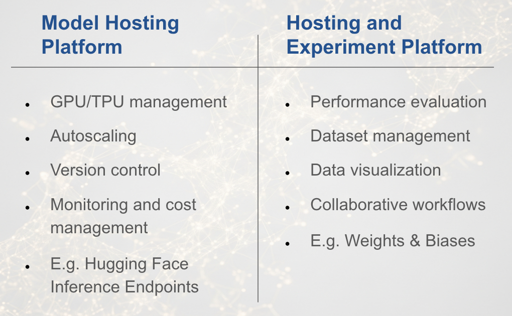 AI oriented hosting and experiment platforms offer a comprehensive environment for not just hosting models but also for the entire machine learning lifecycle. These platforms are incredibly valuable for tasks like fine tuning models to specific datasets and performing thorough evaluations of their performance. They provide robust dataset management and visualization tools making it easier to work with large amounts of data. Collaborative workflows are often a core feature allowing teams to work together seamlessly. Popular examples in this category include Weights & Biases, Comet ML, and the Hugging Face Hub.