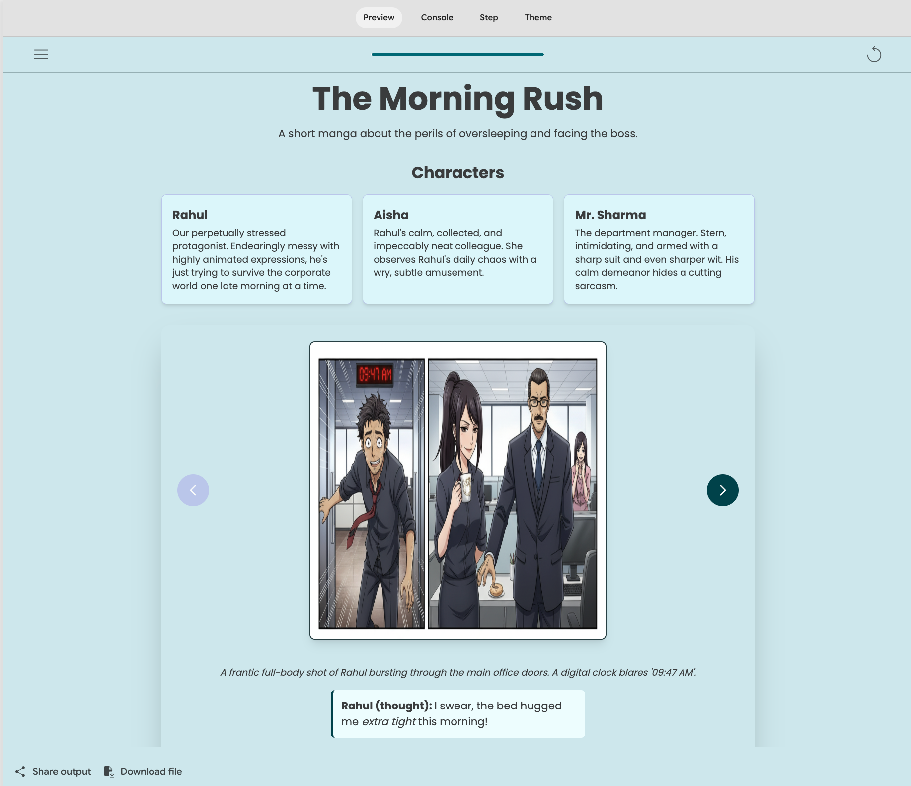 The ultimate goal of our generator is to share its humorous manga stories with a wider audience. Google Opal simplifies the deployment process, allowing you to easily integrate your agent into other applications or share it directly. Once your manga creation is ready, you can easily download the output as an HTML file using the download option. To share your work with others, you’ll first need to share the app itself rather than the output directly. Opal allows you to share your app securely with collaborators or viewers, where you can set specific sharing permissions to control access
